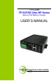 User’s Manual TP-SCPOE-24XX-HP Series Operation Guide NOTICE: 1. Connect the battery to the BAT terminal. Make sure the polarities are correctly connected. Sequentially connect the solar panel to SOL terminal and connect POE source to PoE input (lower) jack. (If solar panel or PoE source is installed before the battery, and if the polarities of the battery be reversed, then the fuse will be burnt.) 2. Make sure the battery is properly connected to the unit.