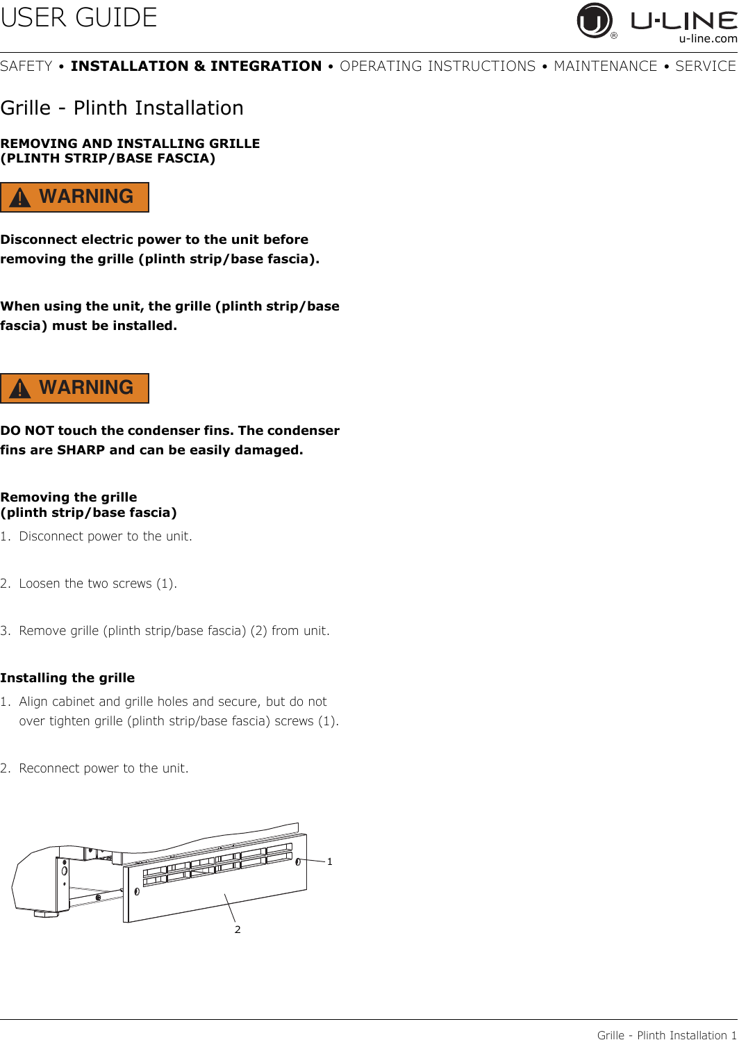 3. Remove grille (plinth strip/base fascia) (2) from unit.