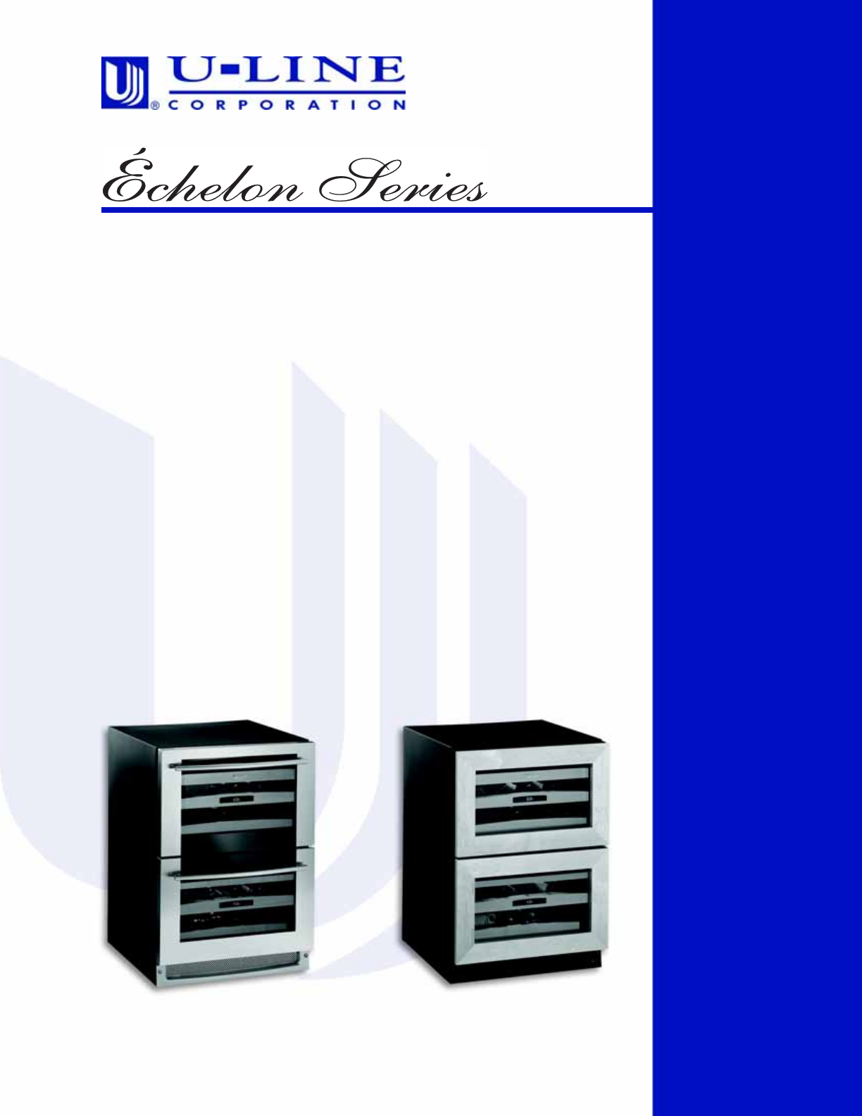 ULIN_016357_30179.fm Page 6 Thursday, February 1, 2007 1:24 PM • Stainless models feature a stainless steel wrap and sculpted stainless handles. 4 Product Features • Wood overlay units feature the ability to match cabinetry. Handles are not included with overlay units. Échelon Wine Captain Your U-Line Wine Captain is the industry’s only built-in under the counter two drawer wine storage unit with dual zone temperature control and up to 43 bottle (750 mL size) capacity.