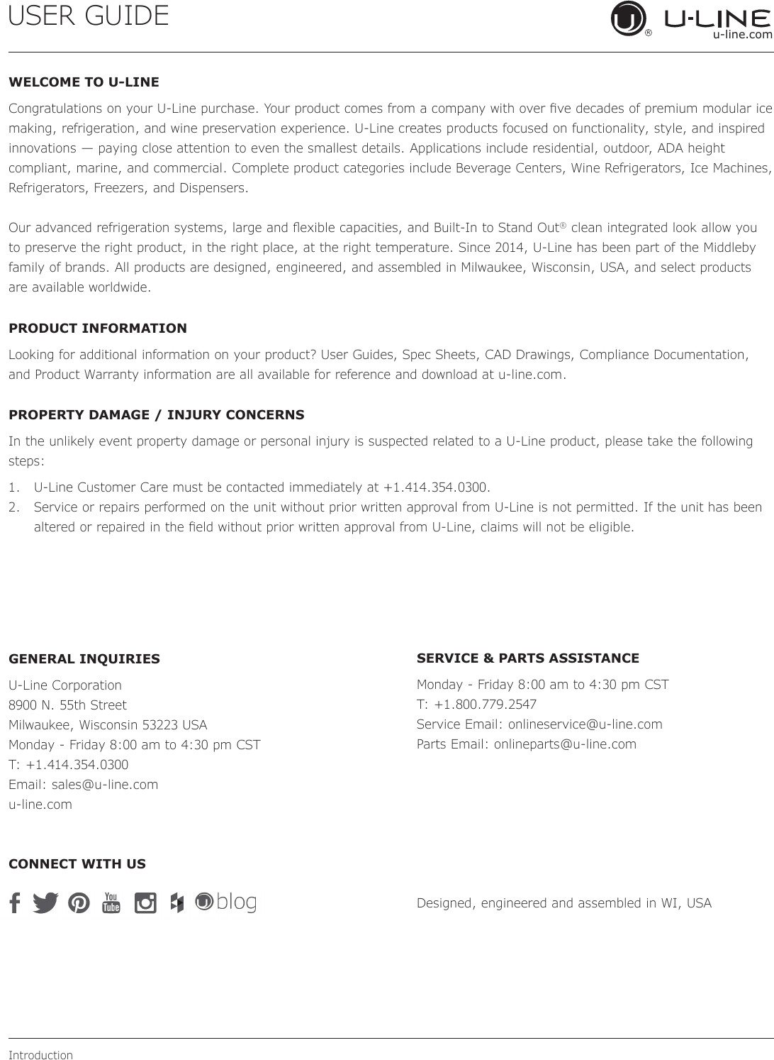 Congratulations on your U-Line purchase. Your product comes from a company with over ve decades of premium modular ice