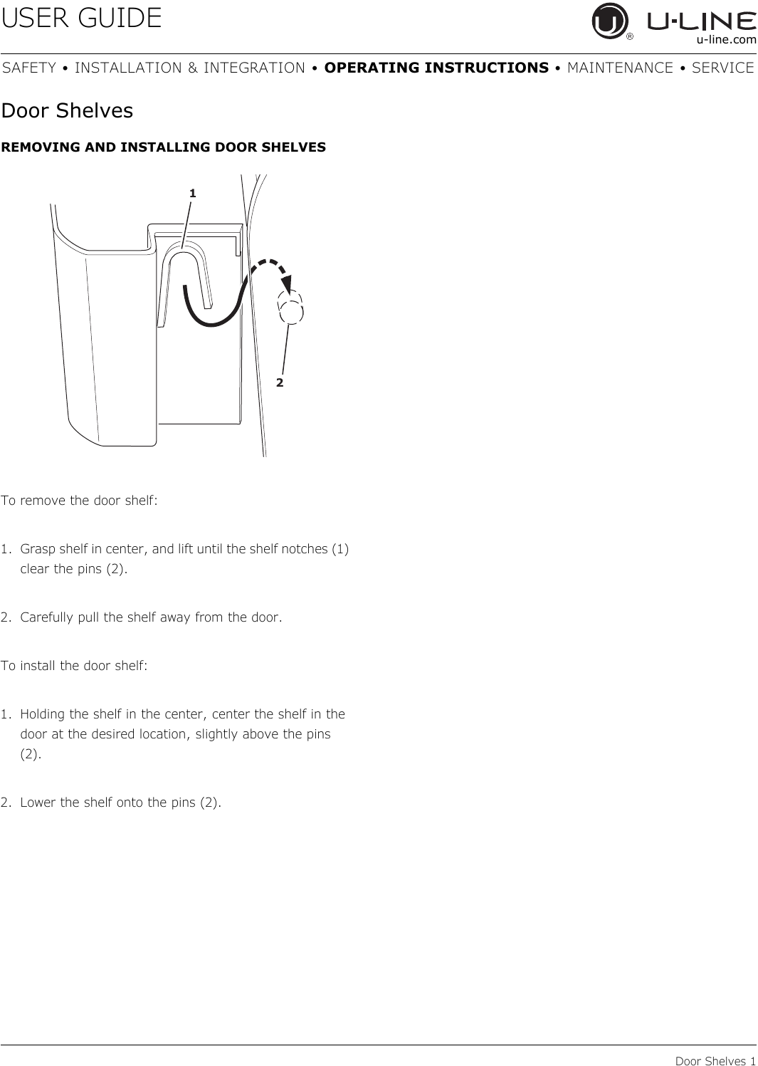 1. Grasp shelf in center, and lift until the shelf notches (1)