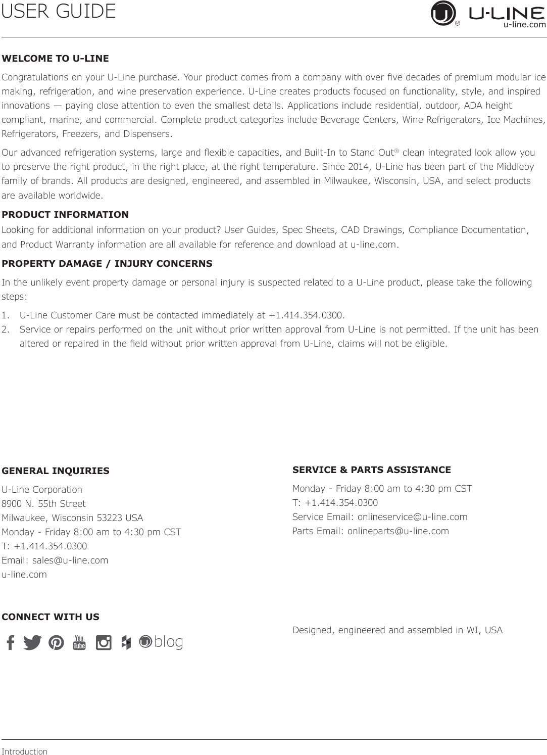 Congratulations on your U-Line purchase. Your product comes from a company with over ve decades of premium modular ice