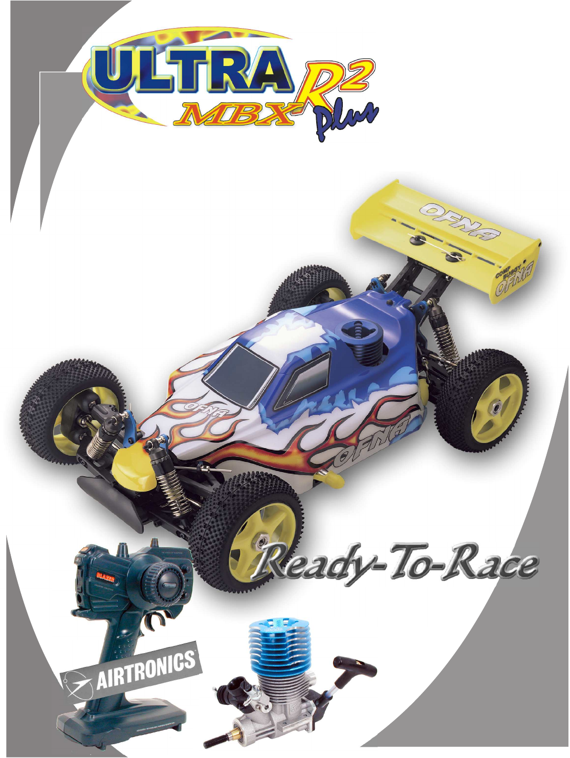 REQUIRED FOR OPERATION THINGS NEEDED You will need to buy a few items to start the engine and run the car. • Use 20% nitro CAR fuel. Do not use airplane fuels, they will over heat engine. • Buy long glow plugs, like OFNA/PICCO P-7 (#51007). Use plugs without idle bar. Do NOT buy hot plugs, like the MC-59. In your box you will find.. • #10218 - Red “C” size glow heater P-7S Glow Fuel 20% 51007 #10211 Battery Pack 1000 NiMh 5cell, flat............... $29.95 #10214 Battery Charger, Overnite $7.