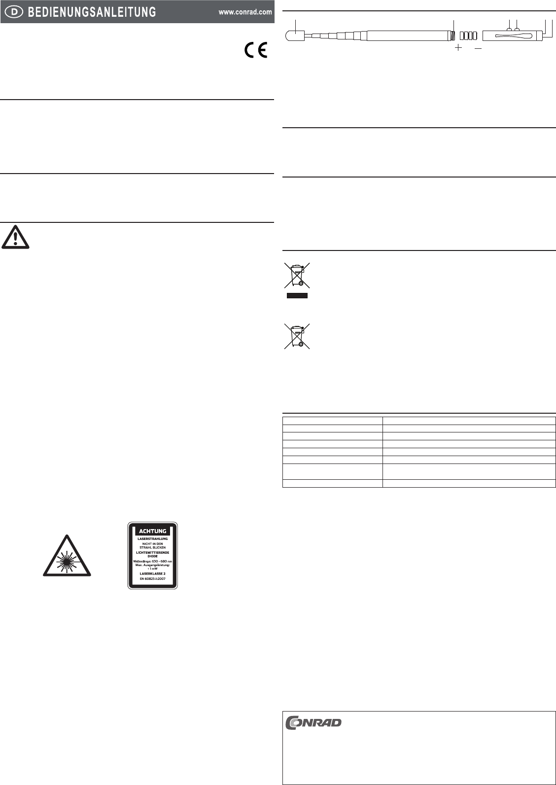 Das Produkt ist mit einem Laser der Laserklasse 2 ausgerüstet. Im Lieferumfang benden sich •