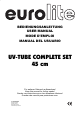 USER MANUAL UV-TUBE COMPLETE SET CAUTION! Keep this device away from rain and moisture! Unplug mains lead before opening the housing! For your own safety, please read this user manual carefully before you initial start-up. Every person involved with the installation, operation and maintenance of this device have to: - be qualilfied - follow the instructions of this manual INTRODUCTION Thank you for having chosen a EUROLITE UV-TUBE COMPLETE SET. Unpack your UV-TUBE COMPLETE SET.