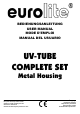 BEDIENUNGSANLEITUNG USER MANUAL MODE D'EMPLOI MANUAL DEL USUARIO UV-TUBE COMPLETE SET Metal Housing Für weiteren Gebrauch aufbewahren! Keep this manual for future needs! Gardez ce mode d’emploi pour des utilisations ultérieures! Guarde este manual para posteriores usos. © Copyright Nachdruck verboten! Reproduction prohibited! Réproduction interdit! Prohibida toda reproducción.