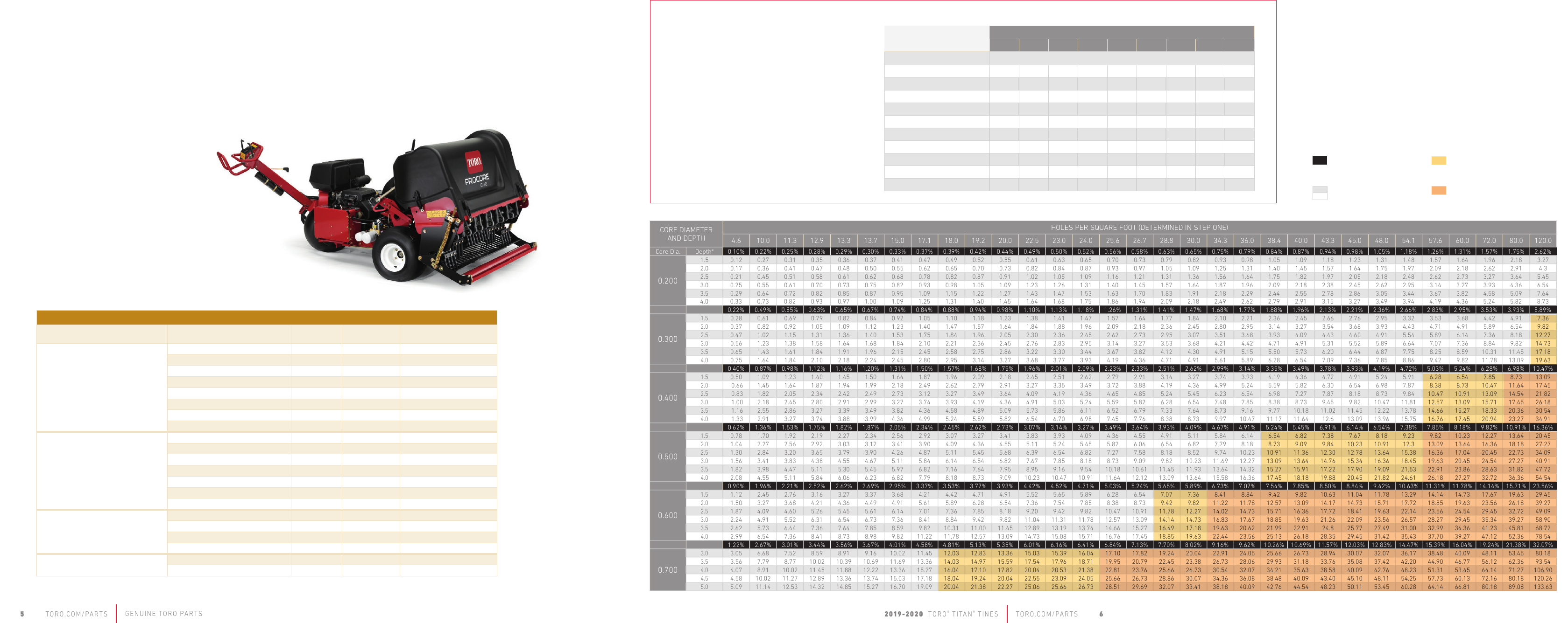 Core Dia. Depth* 0.10% 0.22% 0.25% 0.28% 0.29% 0.30% 0.33% 0.37% 0.39% 0.42% 0.44% 0.49% 0.50% 0.52% 0.56% 0.58% 0.63% 0.65% 0.75% 0.79% 0.84% 0.87% 0.94% 0.98% 1.05% 1.18% 1.26% 1.31% 1.57% 1.75% 2.62%