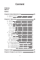 Content Preface Notice Terms 06 Chapter 1: About Adventurer 3 1.1 - Components Introduce 1.2 - Reference 06 07 08 Chapter 2: Operating 2.1 - Unpacking 2.2 - Accessories 2.3 - Interface 2.3.1 - Build 2.3.2 - Tools 2.3.2.1 - NetWork 2.3.2.2 - Preheat 2.3.2.3 - Setting 2.3.2.4 - About 2.3.3 - Filament 2.4 - Print 2.4.1 - Load Filament 2.4.2 - Model File Transfer 2.4.3 - Print 2.4.3.1 - FlashCloud Print 2.4.3.2 - PolarCloud Print 2.4.4 - Model Remove 2.4.5 - Replace Filament 2.