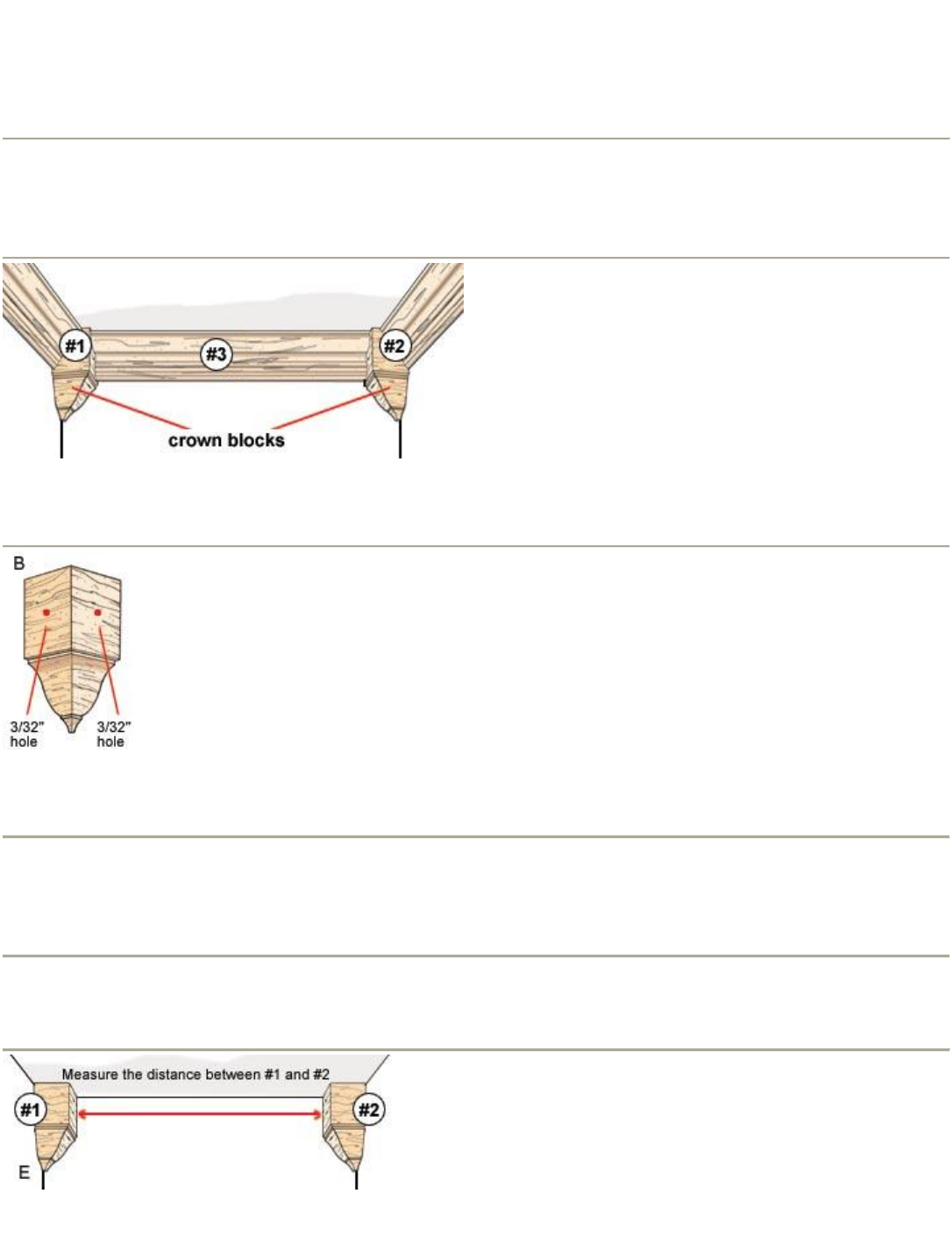 (D) Nail pre-drilled crown blocks in place with 2” finish nails.