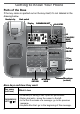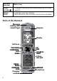 Getting to Know Your Phone Parts of the Base If the key name is spelled out on the key itself, it's not labeled in the drawing below. Handset clip Hook switch Display PHONEBOOK/LEFT PLAY/STOP UP CALLER ID/ RIGHT DOWN Soft keys DELETE 12-key dial pad SPEAKER DO NOT DISTURB INTERCOM/ HOLD Microphone (on back) Base keys and how they work Key name (and icon) What it does Phonebook/ left ( / ) - In standby or during a call: open the phonebook. - During text entry: move the cursor to the left.