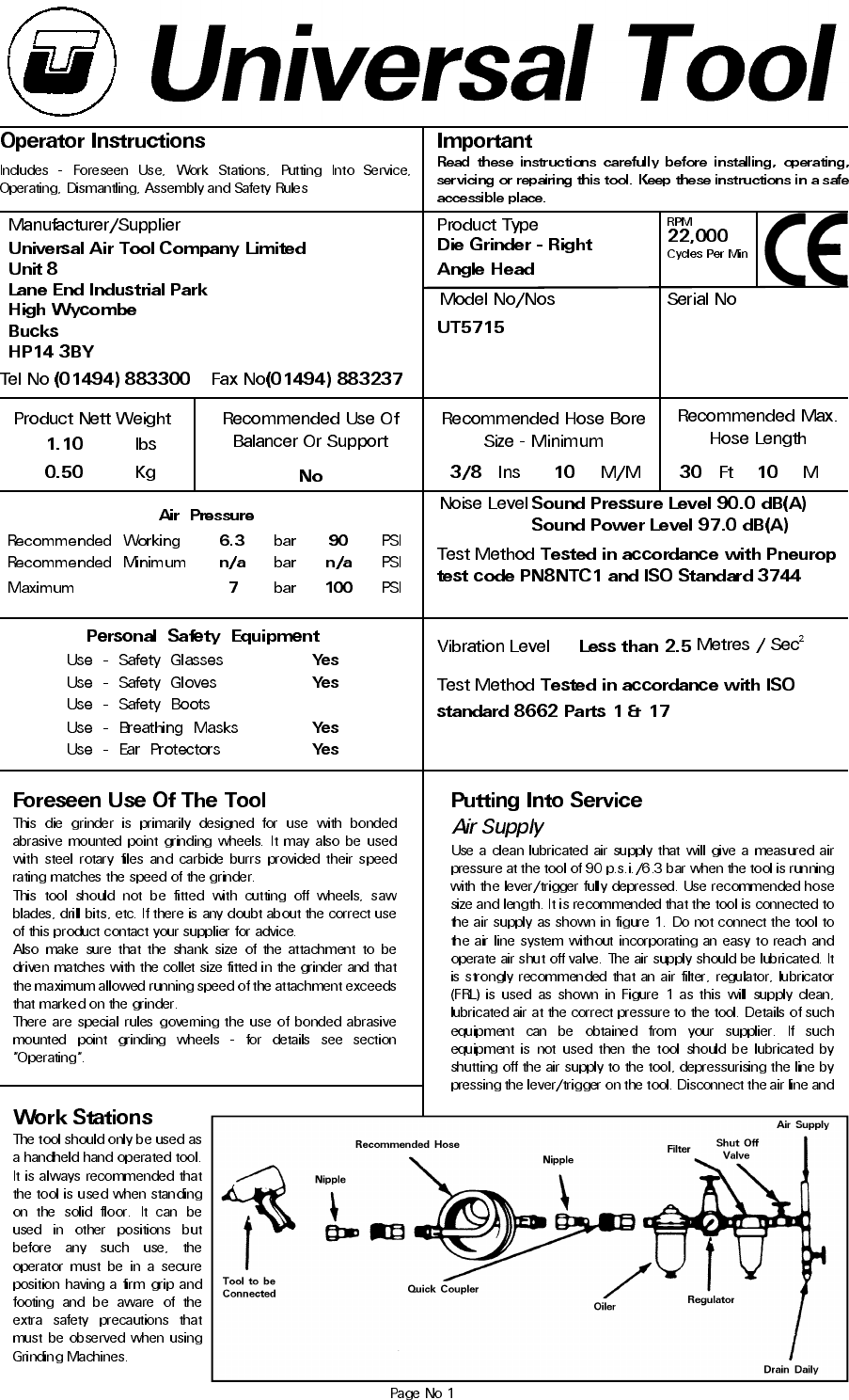 Operator Instructions Includes - Foreseen Use, Work Stations, Putting Into Service, Operating, Dismantling, Assembly and Safety Rules Manufacturer/Supplier Universal Air Tool Company Limited Unit 8 Lane End Industrial Park High Wycombe Bucks HP14 3BY Tel No (01494) 883300 Fax No(01494) 883237 Product Nett Weight 1.10 lbs 0.50 Kg Recommended Use Of Balancer Or Support No Air Pressure Recommended Working 6.