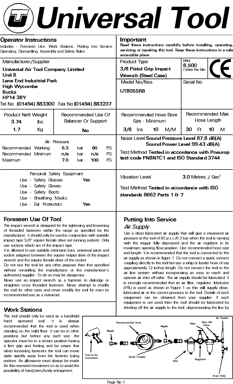 Operator Instructions Includes - Foreseen Use, Work Stations, Putting Into Service, Operating, Dismantling, Assembly and Safety Rules Manufacturer/Supplier Universal Air Tool Company Limited Unit 8 Lane End Industrial Park High Wycombe Bucks HP14 3BY Tel No (01494) 883300 Fax No (01494) 883237 Product Nett Weight 3.74 lbs 1.7 Kg Recommended Use Of Balancer Or Support Air Pressure Recommended Working 6.3 Recommended Minimum n/a Maximum 7.