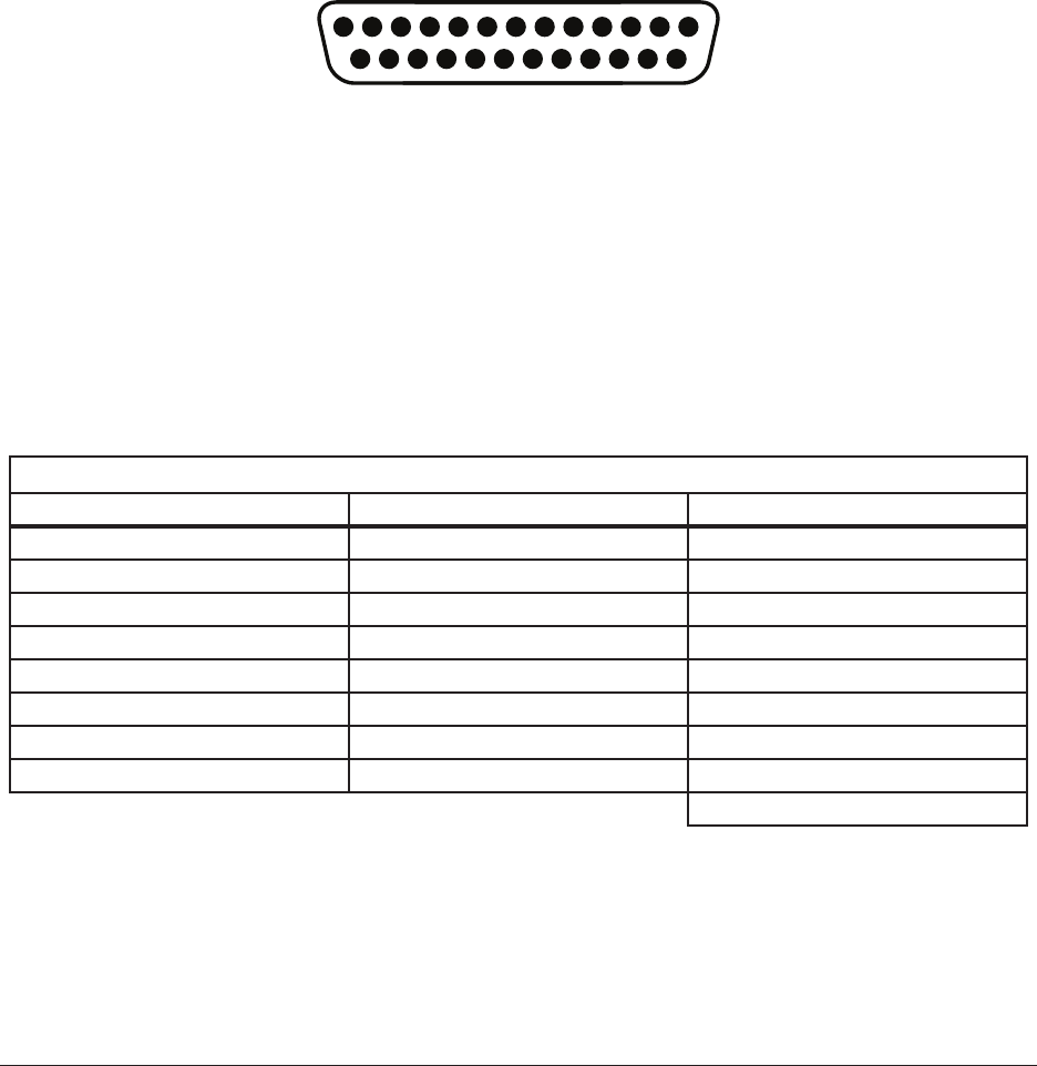 The signals carried on the female DB25 connector pins are listed in the table below. Two