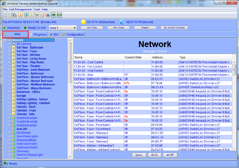The Main tab is where you can add, configure, and manage your INSTEON devices.