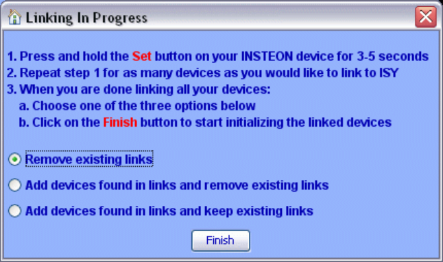 o Remove Existing Links. This option will add the device to the ISY, and