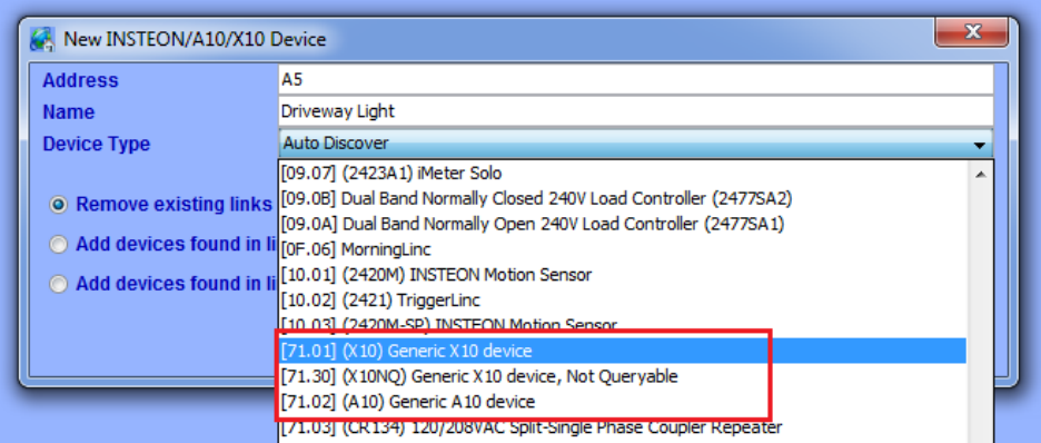 Type the A10/X10 device’s address, name the device, then choose the appropriate