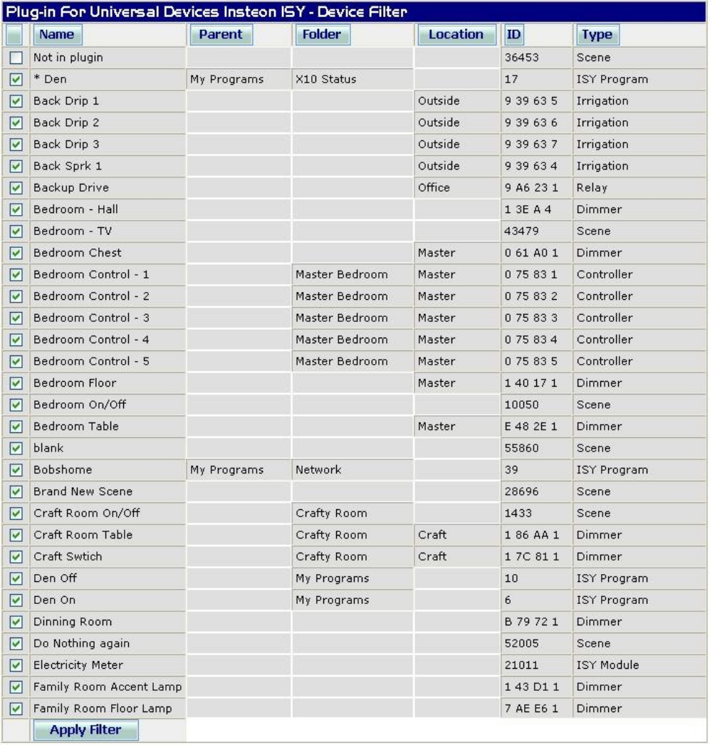 The Device Filter section allows you to hide ISY devices from HomeSeer. Once the ISY