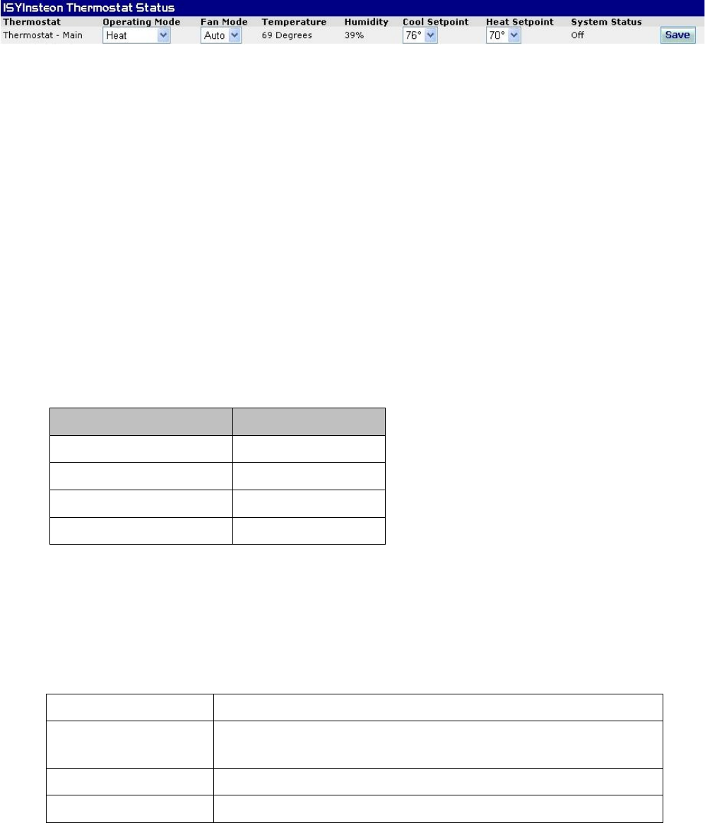 the HomeSeer thermostat API and from a ISY Insteon Plug-in Thermostat Status page.