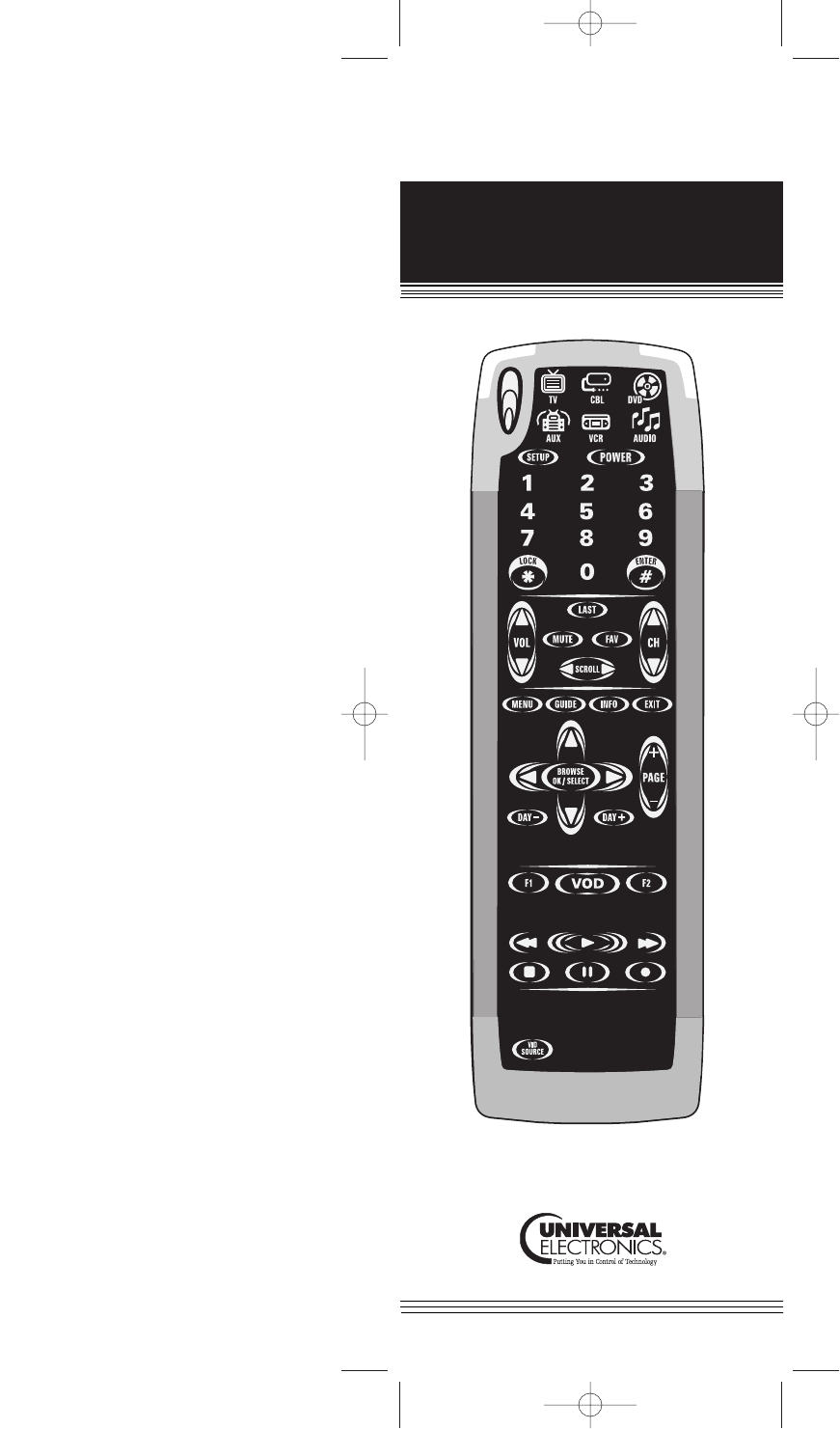 Kameleon C6_v10.qxd 5/14/03 9:16 AM Page 26 KAMELEON-C6 REMOTE Additional Information This product does not have any user-serviceable parts. Opening the case, except for the battery cover, may cause permanent damage to your Kameleon-C6 remote. Copyright 2003 by Universal Electronics Inc.