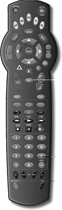 Atlas DVR/PVR Manual 3/20/03 5:00 PM Page 7 Use the keypad numbers (1~ 9, and 0) to directly tune channels (e.g., 09). For amplifiers/receivers, use the keypad numbers to select inputs 1 through 10. In the CBL mode, use ENTER to enter information and to access music channels. In the TV, DVD, or AUX modes for certain devices, press ENTER once after entering a channel number. See your device’s owner’s manual.