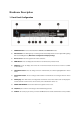 3. Rear Panel Configuration 1. LNB IN_1 Satellite broadcasting signal input socket for the first tuner. Connects a satellite antenna LNB cable. 2. LNB OUT_1 Satellite broadcasting signal output socket through the first tuner. Connects to a second tuner for loop-through. 3. LNB IN_2 : Satellite broadcasting signal input socket for the second tuner. Connects a satellite antenna cable or from the first tuner LNB OUT_1 connector. 4.