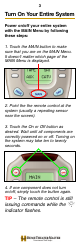 3 Turn On Your Entire System Power on/off your entire system with the MAIN Menu by following these steps: 1. Touch the MAIN button to make sure that you are on the MAIN Menu. It doesn’t matter which page of the MAIN Menu is displayed. 2. Point the the remote control at the system (usually a repeating sensor near the screen). 3. Touch the On or Off button as desired. Wait until all components are correctly powered on or off. Turning on the system may take ten to twenty seconds. 4.