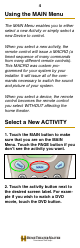 4 Using the MAIN Menu The MAIN Menu enables you to either select a new Activity or simply select a new Device to control. When you select a new activity, the remote control will issue a MACRO (a timed sequence of many commands from many different remote controls). This MACRO was custom programmed for your system by your installer. It will issue all of the commands necessary to switch the sound and picture of your system.