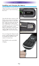 MX-880 OWNERS MANUAL Installing and Charging the Battery Open the battery cover by pressing on the release clip and removing the cover. Note that the three contacts on the battery must connect to the three spring-loaded contacts in the MX880. Angle the battery into the battery compartment, contacts first, then gently fit the rear of the battery into the compartment as well. Replace the battery cover by inserting the hinged end in first, then snapping the cover back into place.