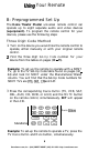 using Your Remote Note: SET appears in the LCD for 20 seconds to indicate that the remote control is ready to be programmed. The following steps must be entered while SET appears in the LCD. 4 Point the remote control toward the device that was turned on in Step 1 and press in the first three-digit SetUp Code number for that device using the number buttons (O-9) on the remote control. SET followed by the number will appear in the LCD.