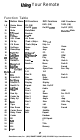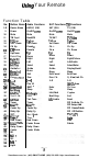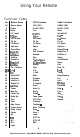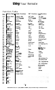 Using Your Remote Function Table No. Button Name VCR Functions Cable Functions 1-8 9 10 11 12 13 14 15 16 17 18 19 20 21 22 23 24 25-34 35 36 37 38 39 40 41 42 43 44 45 46 47 48 49 50 51 52 53 54 55 Device Name Power Mute T/V Input VOL up VOL Down CH Up CH Down Up/Pause Down/Stop Right/F.F. Left/Rew Sel/Play Guide/I<< Menu/>>1 ExWRec Pre. Ch./Eject 1-O lO+ Enter/Shift Fav/Sleep Info/Pro. L. Next/3 Ch. AWTest Tuner Rear Up Center Up Delay Up Surr.