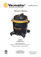 Wet/Dry Vacuum Operator’s Manual 16 Gallon Model No. VJH1612PF 0201 FOR YOUR SAFETY Read and understand this manual before use. Keep this manual for future reference. Distributed By Cleva North America, Inc. 601 Regent Park Court Greenville, SC 29607 Replacement Filters & Accessories available at: Vacmaster.