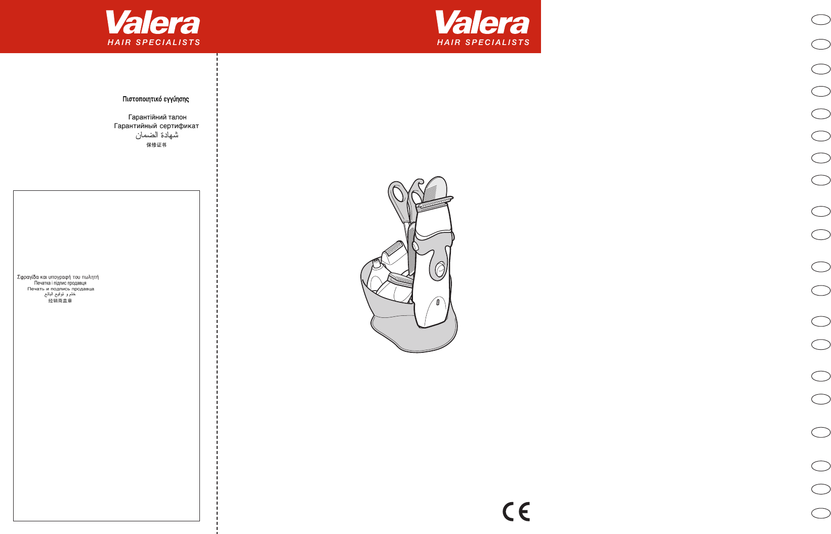 00060589 int aprile2013 04/04/2013 12.46 Pagina 67 • Після чистки приладу треба приєднати до нього насадку, тому що вона також допомагає захистити лезо. • Блок-лезо з керамiки не потребує змащення. ЗНИЩЕННЯ Знищуйте прилад у відповідності з усіма вимогами законодавства щодо захисту навколишнього середовища Цей прилад відповідає вимогам європейських директив 2004/108/CE, 2006/95/CE, 2009/125/CE та регламенту (CE) № 278/2009. ГАРАНТIЯ VALERA надає гарантiю на придбаний Вами прилад за таких умов: 1.
