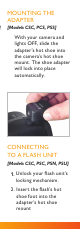 ] MOUNTING THE ADAPTER [Models CSC, PCS, PSS] With your camera and lights OFF, slide the adapter’s hot shoe into the camera’s hot shoe mount. The shoe adapter will lock into place automatically. CONNECTING TO A FLASH UNIT [Models CSC, PSC, PSN, PSU] Unlock your flash unit’s locking mechanism. 2.