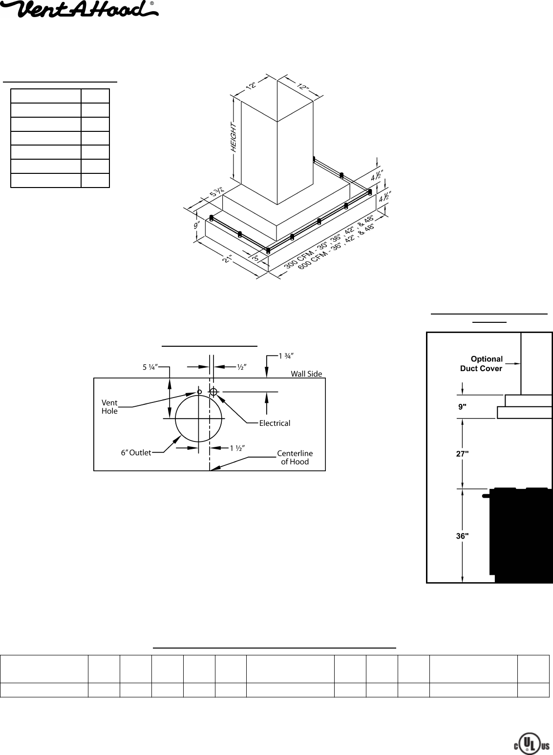 WALL MOUNT RANGE HOOD SPECIFICATIONS