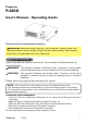 Projector PJ400 User's Manual – Operating Guide Thank you for purchasing this projector. WARNING ►Before using, read the "User's Manual - Safety Guide" and these manuals to ensure correct usage through understanding. After reading, store them in a safe place for future reference. About this manual Various symbols are used in this manual. The meanings of these symbols are described below.