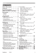 Contents Contents About this manual . . . . . . . . . . 1 Contents . . . . . . . . . . . . . . . . . 2 Projector features . . . . . . . . . . 3 About contents of package . . 3 Part names . . . . . . . . . . . . . . . 4 Projector . . . . . . . . . . . . . . . . . . . . . 4 Controls . . . . . . . . . . . . . . . . . . . . . . 5 Remote control . . . . . . . . . . . . . . . . 5 Preparations . . . . . . . . . . . . . . 6 Fastening the lens cover . . . . . . . . . 6 Putting batteries . . . . . . . . . . . . . .