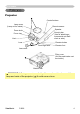 Part names Part names Projector Control buttons Lamp cover (Lamp unit is inside.) Remote sensor Speaker Zoom knob Security bar (Use for attaching a commercial anti-theft chain or wire.) Focus ring Vent Lens Elevator button Front-Right side Elevator foot Lens cover Filter cover (Air filter and intake vent are inside.) Bottom side WARNING ►During use or immediately after use, do not touch around the lamp and vents of the projector. ( ) It could cause a burn.