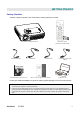 GETTING STARTED Packing Checklist Carefully unpack the projector and check that the following items are included: DLP PROJECTOR WITH LENS CAP 250V POWER CABLE CD-ROM (THIS USER’S MANUAL) USB CABLE REMOTE CONTROL (WITH TWO AAA BATTERIES) S-VIDEO CABLE MULTI-LANGUAGE QUICK START GUIDE COMPUTER CABLE (DVIDB15) CARRYING CASE Contact your dealer immediately if any items are missing, appear damaged, or if the unit does not work. Caution: 1. Avoid using the projector in dusty environments. 2.