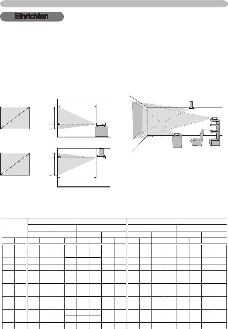 Die Bildgröße und den Projektionsabstand können Sie in den untenstehenden Abbildungenund Tabellen ablesen.