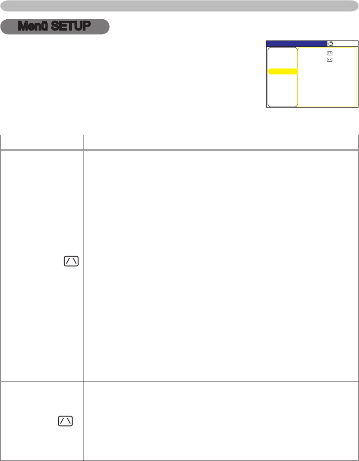 Im Menü SETUP können die in der Tabelle aufgeführten