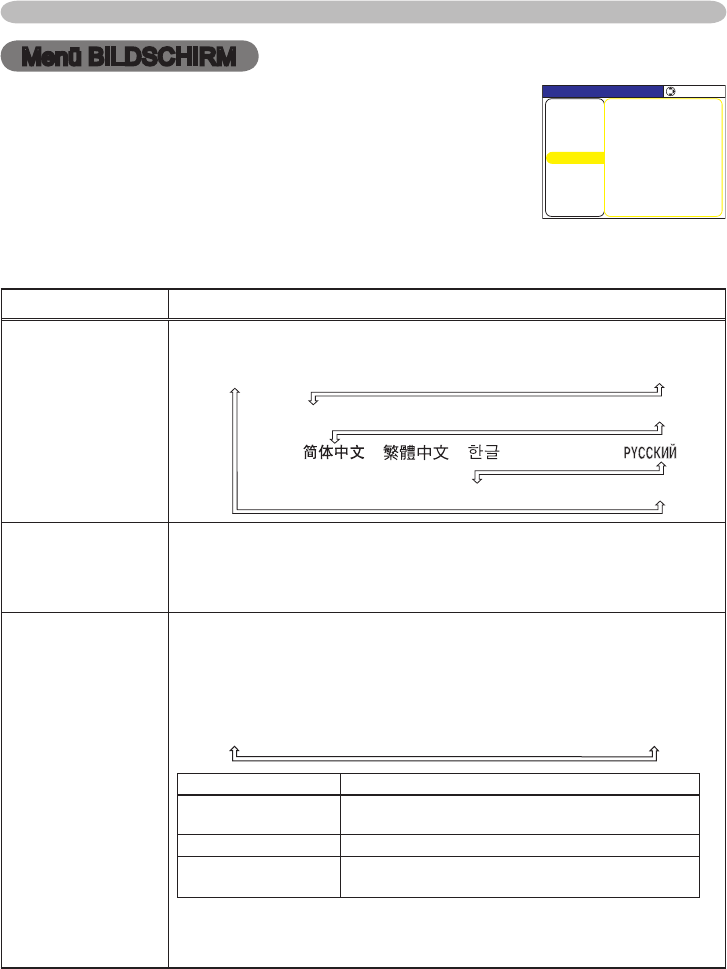 Im Menü BILDSCHIRM können die in der nachstehenden