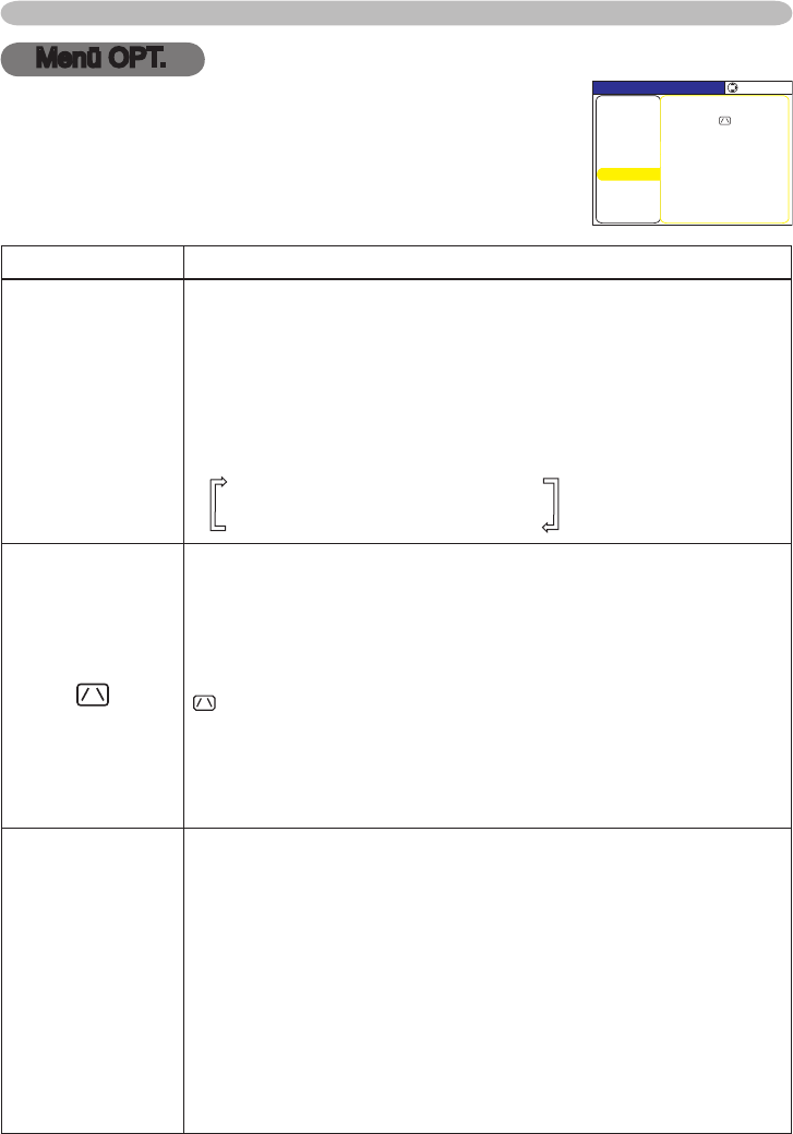 Im Menü OPT. können die in der nachstehenden Tabelle genannten