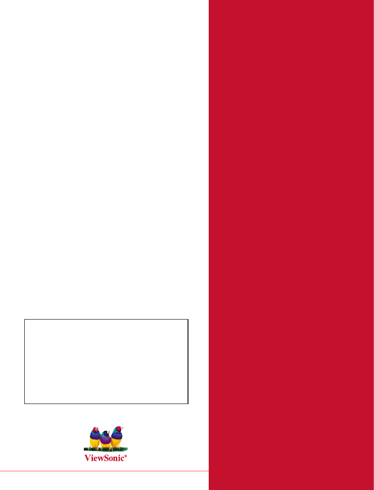 Customer Support For technical support or product service, see the table below or contact your reseller. Note : You will need the product serial number. Country/Region Web Site Australia/New Zealand www.viewsonic.com.au T=Telephone F=Fax AUS=1800 880 818 NZ=0800 008 822 E-mail service@au.viewsonic.com T (Toll-Free)= 1-866-463-4775 Canada www.viewsonic.com T (Toll)= 1-424-233-2533 service.ca@viewsonic.com F= 1-909-468-3757 Europe www.viewsoniceurope.com www.viewsoniceurope.