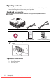 Shipping contents Carefully unpack and verify that you have all of the items shown below. If any of these items are missing, please contact your place of purchase. Standard accessories The supplied accessories will be suitable for your region, and may differ from those illustrated. Projector Power Cord VGA Cable Multi-language user manual DVD Quick Start Guide Remote Control & Battery Pull the tab before using the remote control. Optional accessories 1. 2. 3.