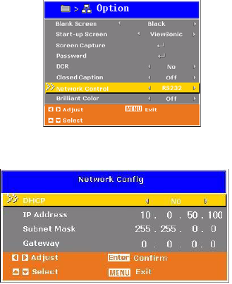 Select either RS232 or LAN for network control. If RS232 is selected, user will not able