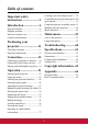 Table of contents Creating your own startup screen ...... 38 Controlling the projector through a LAN environment ....................................... 39 Using the projector in standby mode. 43 Shutting down the projector .............. 44 Menu operation.................................. 45 Important safety instructions .......................2 Introduction......................4 Projector features ................................. 4 Shipping contents.................................