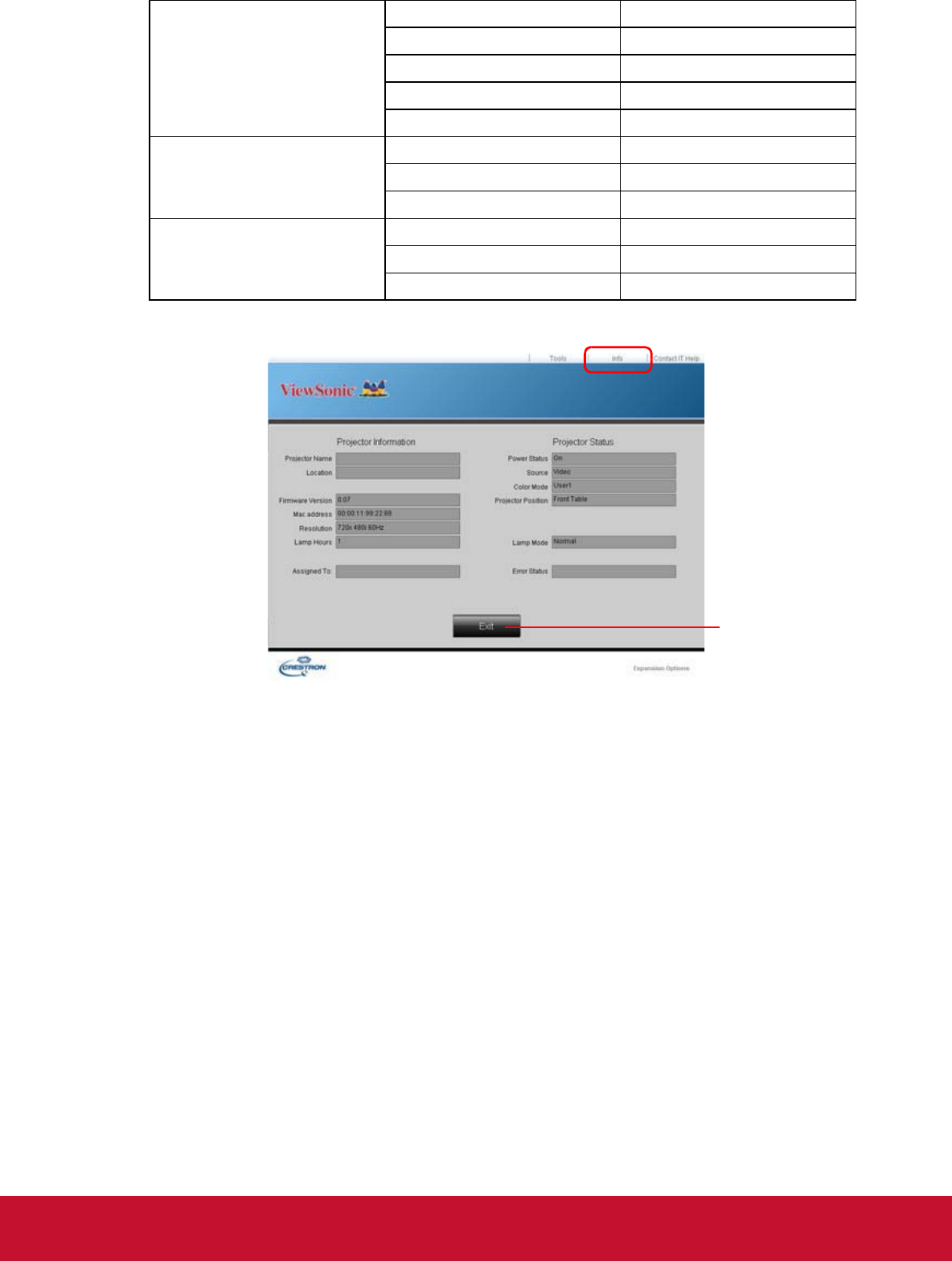 4. The info page displays the information and status of this projector.