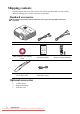 Shipping contents Carefully unpack and verify that you have all of the items shown below. If any of these items are missing, please contact your place of purchase. Standard accessories The supplied accessories will be suitable for your region, and may differ from those illustrated. Projector Power Cord VGA Cable Multi-language user manual DVD Quick Start Guide Remote Control & Battery PointBlank pen (PJD7383i/ PJD7583wi only) USB Cable (PJD7383i/ PJD7583wi only) Optional accessories 1. 2. 3.