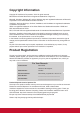 Copyright Information Copyright © ViewSonic® Corporation, 2012. All rights reserved. Macintosh and Power Macintosh are registered trademarks of Apple Inc. Microsoft, Windows, Windows NT, and the Windows logo are registered trademarks of Microsoft Corporation in the United States and other countries. ViewSonic, the three birds logo, OnView, ViewMatch, and ViewMeter are registered trademarks of ViewSonic Corporation. VESA is a registered trademark of the Video Electronics Standards Association.