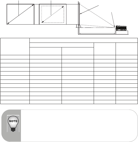 Refer to the graphic and table below to determine the screen size and projection distance.